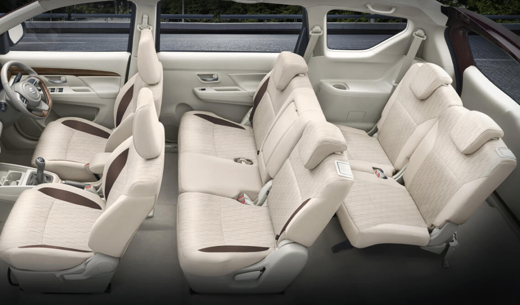 Inside the cabin, a well-furnished dual-tone dashboard with fine wood touches greets you as if to say, “Welcome to class.” The Ertiga 2025 Top represents maximum comfort for family members as well as long-distance travel.